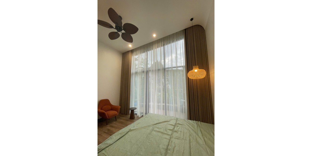 Rèm voan được thiết kế đơn giản nhưng không kém phần nổi bật, sử dụng chất liệu voan mỏng với độ rủ tự nhiên, giúp tăng cường ánh sáng tự nhiên mà vẫn giữ được sự riêng tư. Sự kết hợp giữa rèm voan và rèm roman mang lại tính linh hoạt, cho phép gia chủ dễ dàng điều chỉnh ánh sáng và không khí trong phòng.