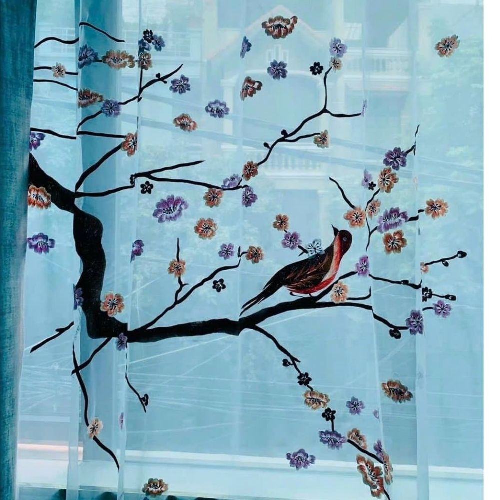 Rèm thêu tay nghệ thuật trên nền voan trắng là một trong những sản phẩm mang đậm tính thẩm mỹ và phong thủy. Với các họa tiết thêu tỉ mỉ như hoa hồng leo, hoa đào, hoa mai, lá dong, và tre trúc, rèm không chỉ giúp điều chỉnh ánh sáng mà còn tạo nên không gian sống tươi mới, thanh thoát và tràn đầy năng lượng tích cực. Đây là sự kết hợp hoàn hảo giữa nghệ thuật thêu tay và chất liệu voan trắng nhẹ nhàng, mang đến vẻ đẹp thanh thoát và sang trọng cho mọi không gian.