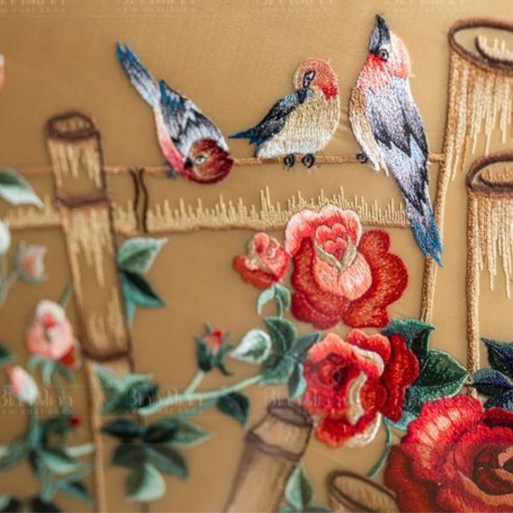 Rèm thêu tay nghệ thuật với các họa tiết hoa hồng leo, hoa đào, hoa mai, lá dong và tre trúc sẽ tạo nên một điểm nhấn đặc biệt cho không gian. Các họa tiết thêu này không chỉ mang lại vẻ đẹp tinh tế mà còn giúp tăng thêm sự sang trọng, độc đáo cho căn phòng.