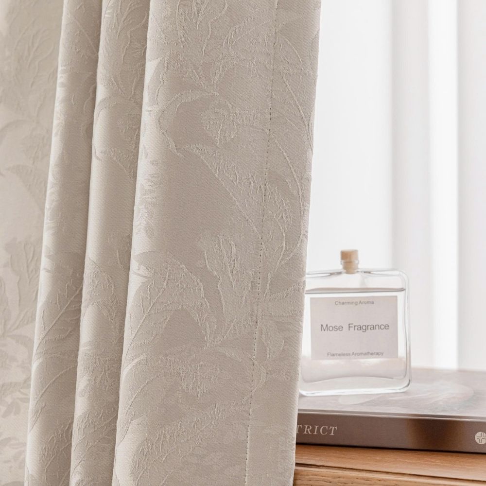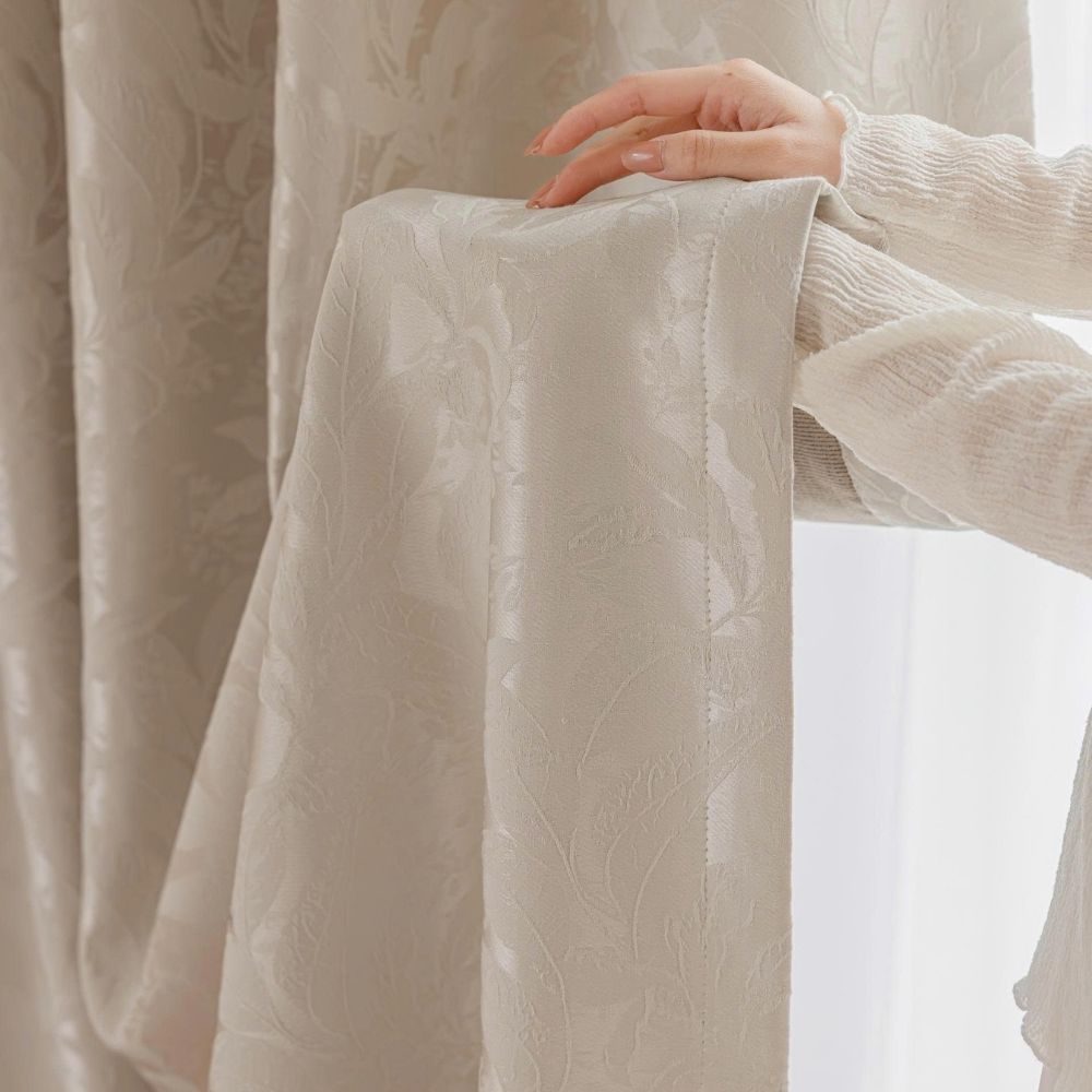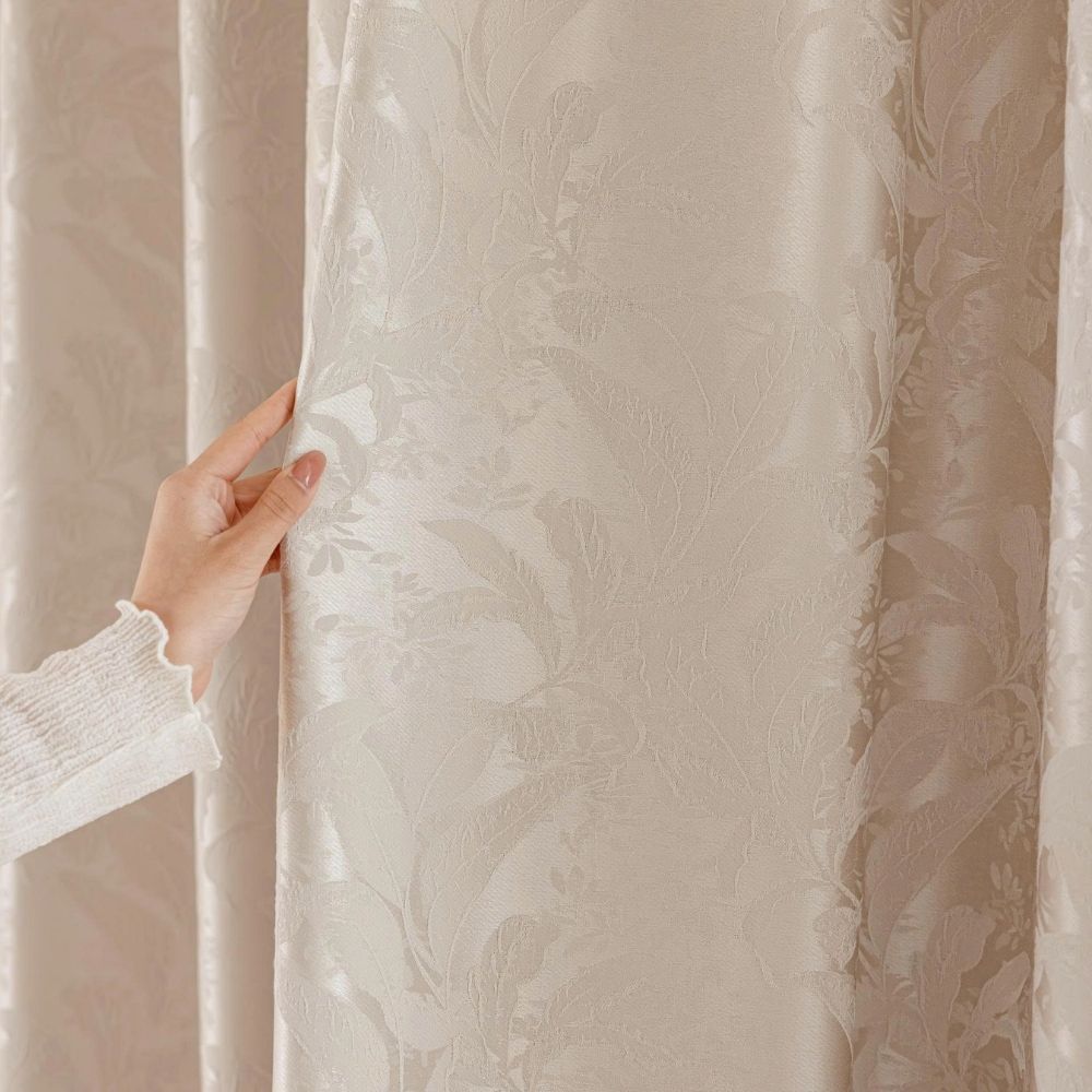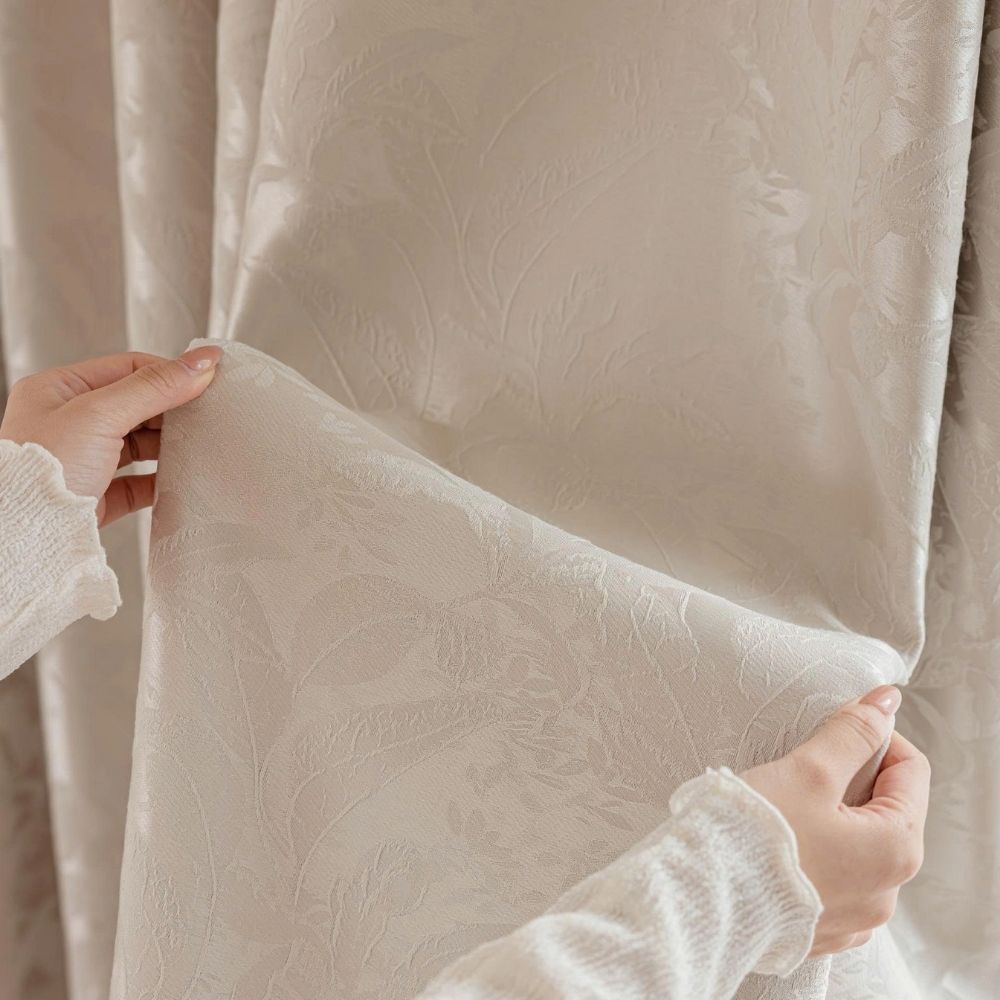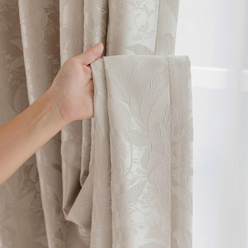Bề mặt vải được dệt họa tiết hoa lá tinh xảo, tạo chiều sâu và sự mềm mại cho bộ rèm.