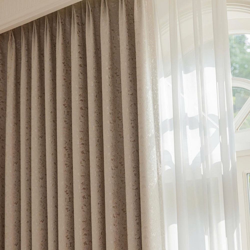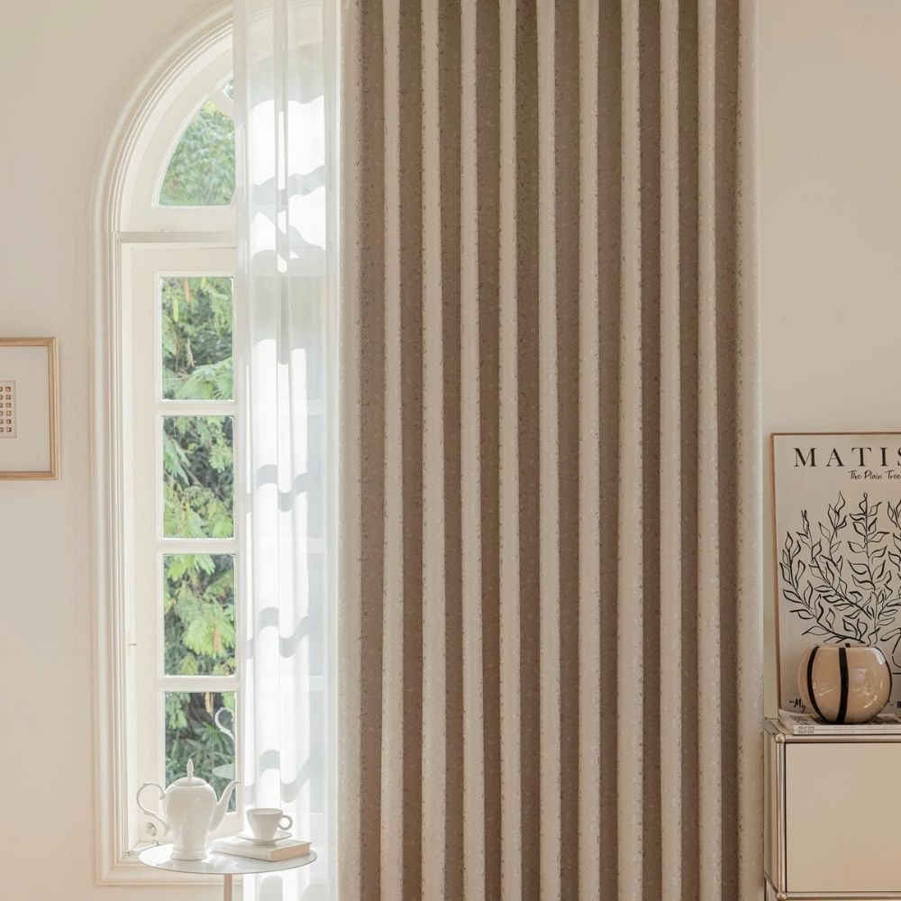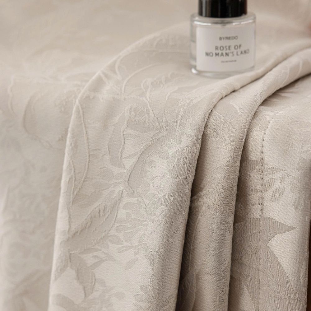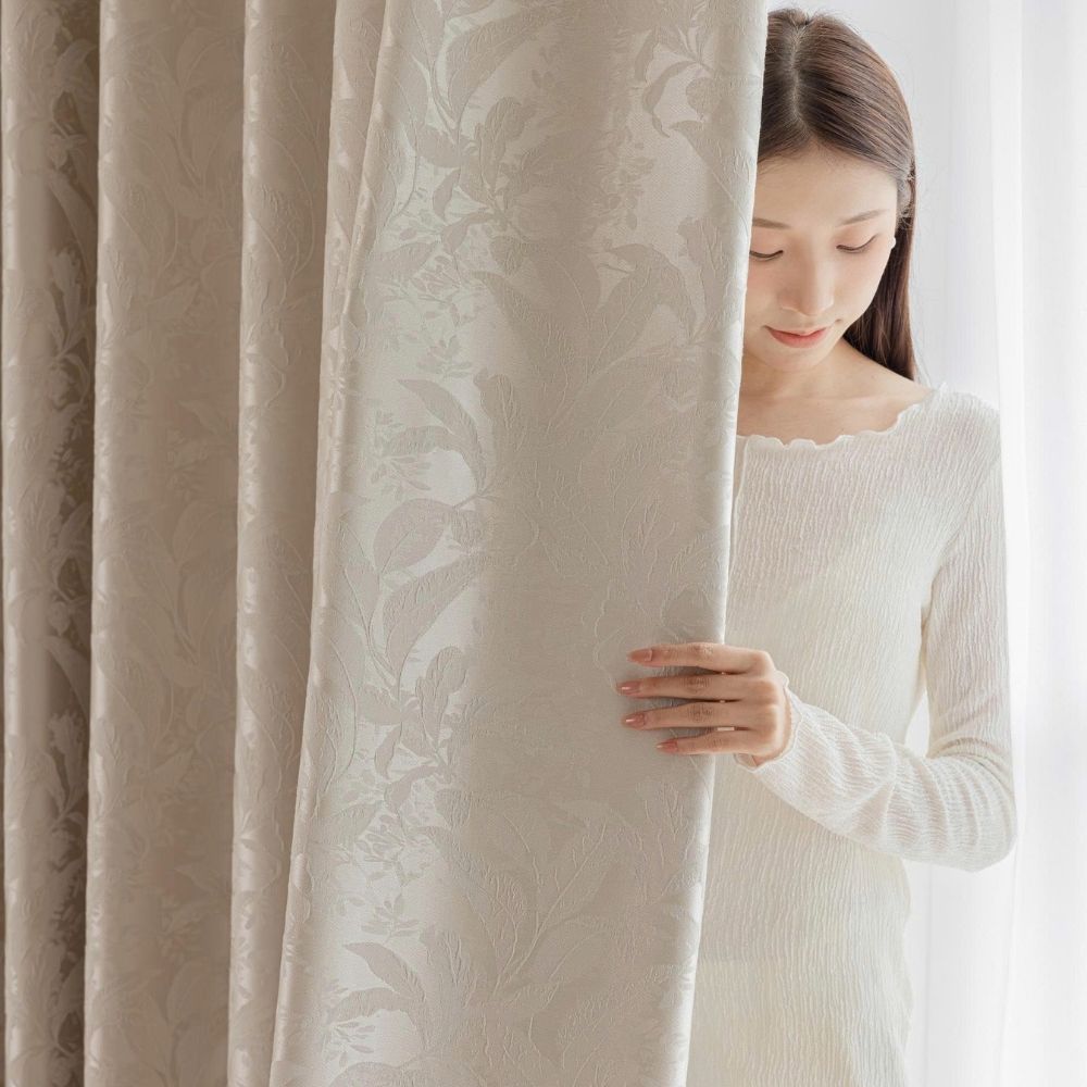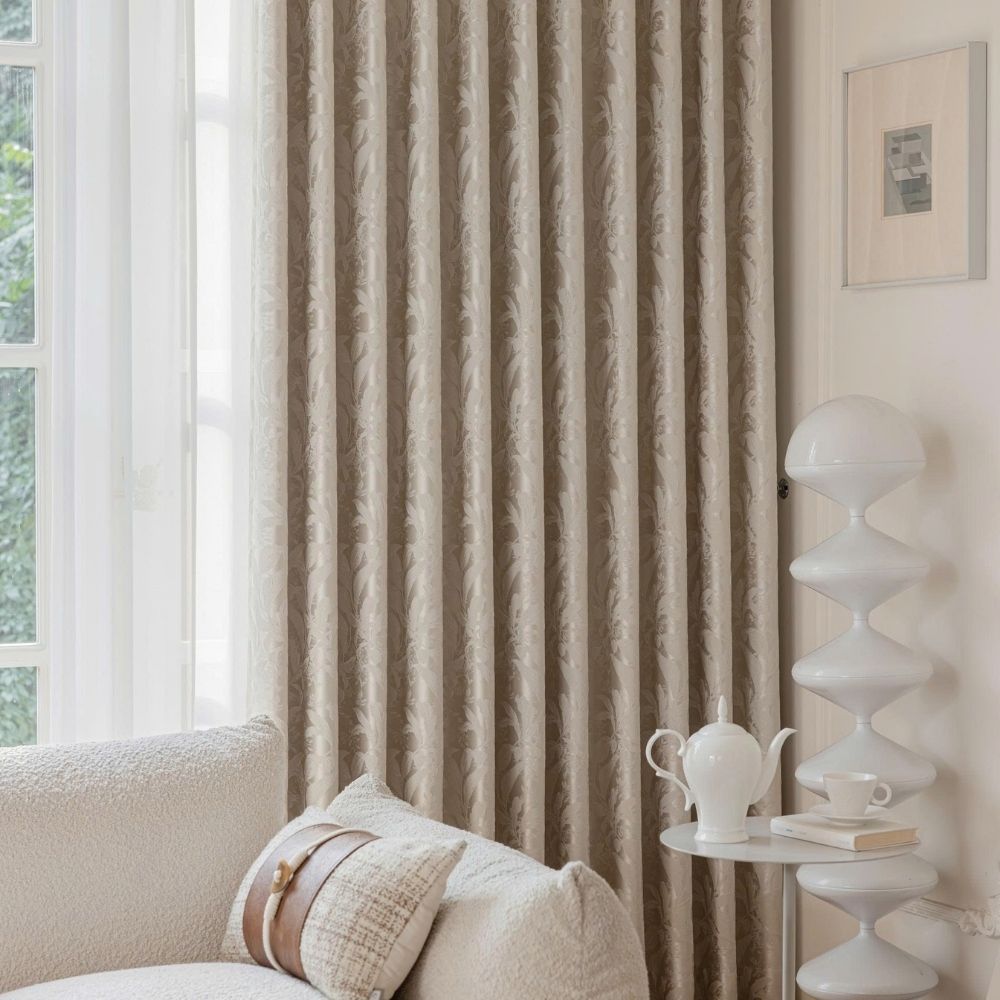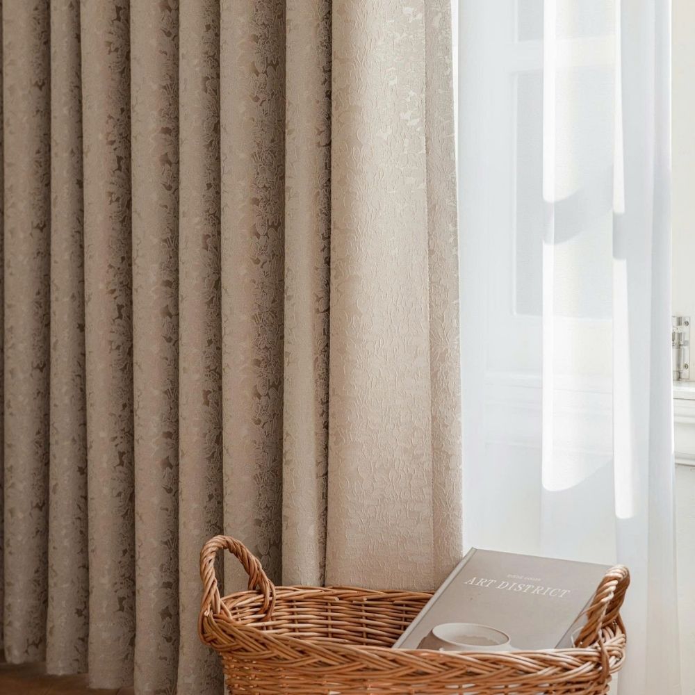 Bề mặt vải được dệt họa tiết hoa lá tinh xảo, tạo chiều sâu và sự mềm mại cho bộ rèm.